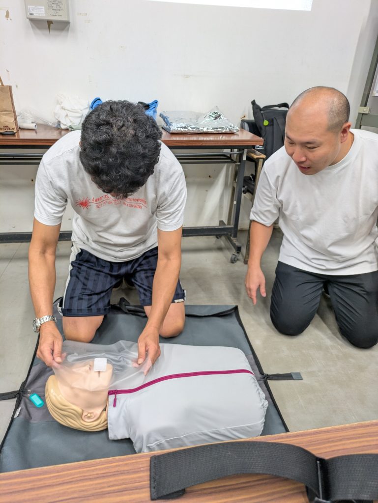 初日は陸上で座学。講師は救命救命士の吉澤さん。現場での経験豊富で熱中症、低体温症の対処方法、要救急者の搬送方法等胸骨圧迫法(心臓マッサージ)そしてAED(練習様をレンタル)を実績した。ところどころで強化委員の佐々木さんが附則で解説が入る。事故が起きたら救急隊員にベストな状態で渡す。初期動作数分でその人の命が決まる。それまでに何をどうするのか順序だて現場での経験からレクチャーして頂きました。レーザーの大会で負傷者が出た場合のフローチャートや実際に119番した際の伝達の仕方などなど目からウロコでした。今までがテキトー過ぎたと反省。